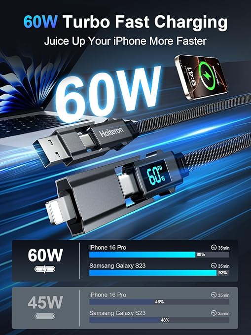 - [What You Get] Haiteron 3FT 60W 4-in-1 Multi Charging Cable, a length suitable for any situation, so you no longer need to stay near a power outlet. And Haiteron reliable after-sales service is available 24/7 hours—if you have any questions or issues, feel free to contact us. We guarantee resolution within 24 hours.