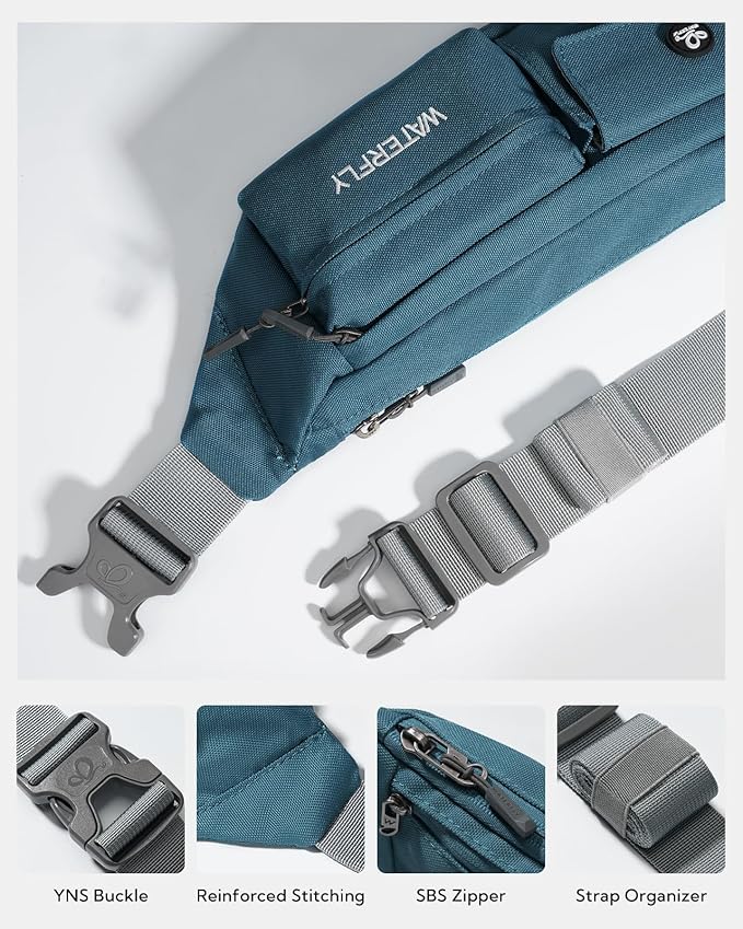 WATERFLY Small Crossbody Fanny Pack: 5 Pocket Slim Lightweight Waist Belt Hip Bag for Women Men Water Resistant Chest Pouch for Travel Hiking Running Walking Fit All Phones - Peacock Blue