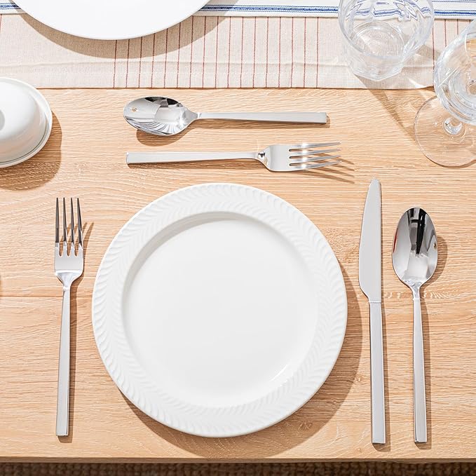 - Set Includes: 20-piece flatware set includes 4 dinner knife (9.38 inch/3.63 oz),4 dinner fork (8.24 inch/2.6 oz), 4 dinner spoon (8.1 inch/2.98 oz), 4 salad fork (7.66 inch/2.01 oz) and 4 teaspoon (7.28 inch/2.08 oz), service for 4