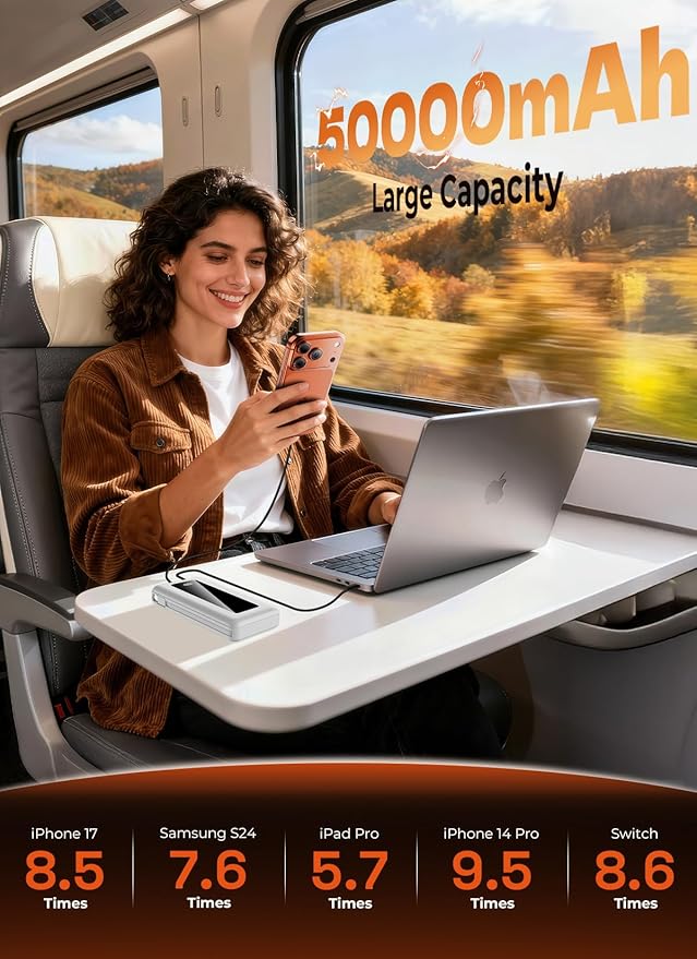 - 50000mAh Capacity Built for Extended Use:Engineered for reliability, this 50000mAh power bank delivers long-lasting power for travel, camping, and emergency situations. Its ultra-large capacity supports up to 8 full charges for iPhone 17 or 5 charges for iPad Pro—ideal for users who demand dependable energy on long outdoor trips, road adventures, and blackout preparation. A premium portable charger designed to keep you powered for days.