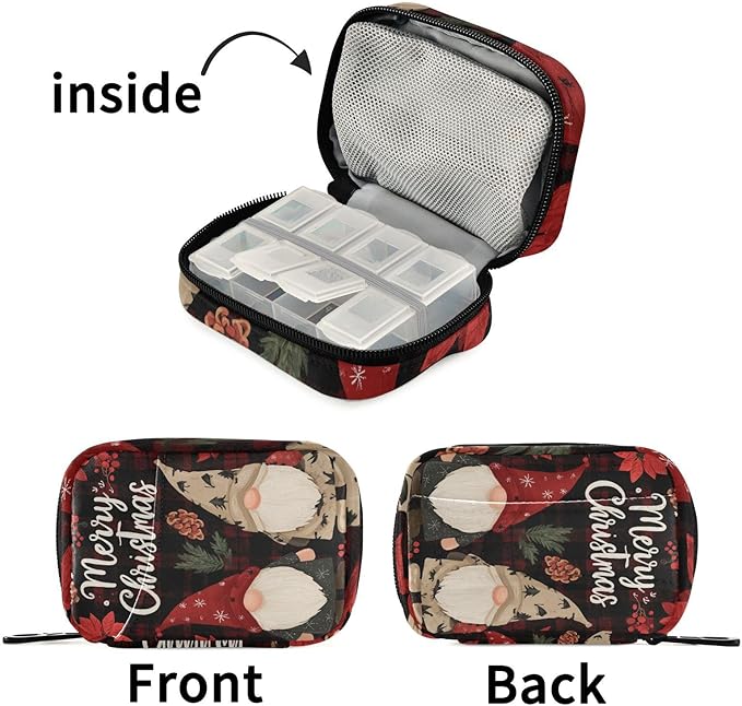 Checkered Christmas Floral Gnomes Travel Pill Organizer Case Box Container Weekly Portable Vitamin Medicine Holder Storage Bag with Zipper Removable