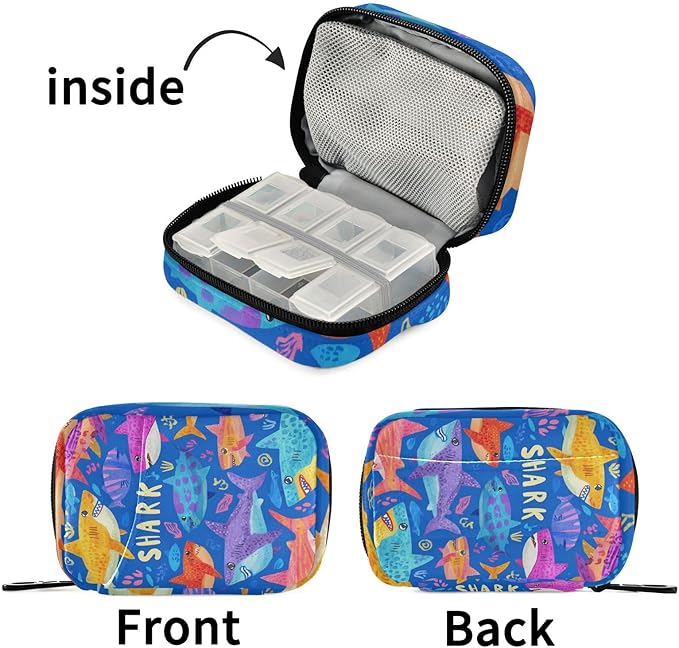 Colorful Bright Blue Sharks Travel Pill Organizer Case Box Container Weekly Portable Vitamin Medicine Holder Storage Bag with Zipper Removable