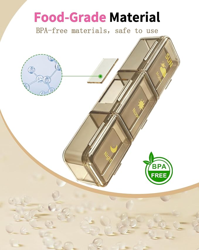 - Special Feature : 3x A Day Compartments Pill Organizer for a Week, Child Resistant, Moisture Proof, Spill Proof, Stackable 3x A Day Compartments Pill Organizer for a Week, Child Resistant, Moisture Proof, Spill Proof, Stackable