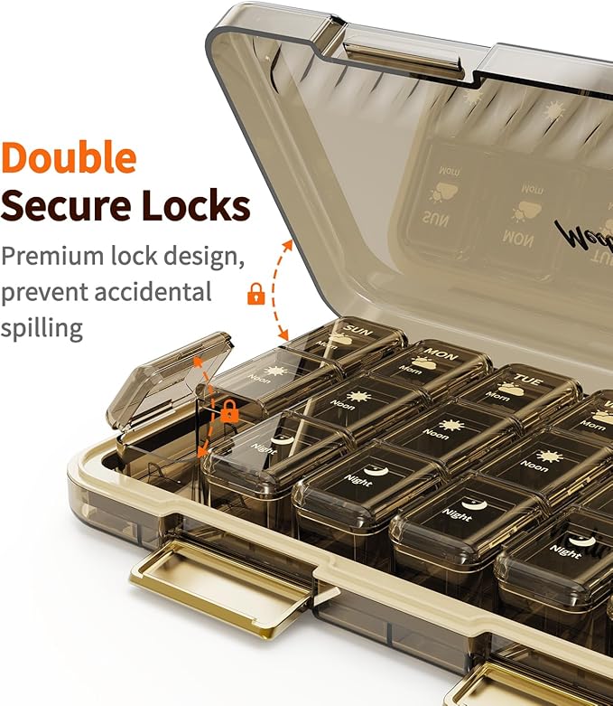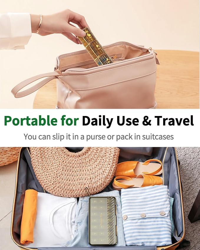 - Dual Safety Lock Pill Case: With secure, snap-shut lids on each compartment and two gold flip latches in the main organizer, this pill container ensures your supplements stay safe and sealed—even in your bag. No need to worry about accidental openings from pets, children, or accidental bumps. Once locked, the lids stay firmly in place, offering you reliable protection.