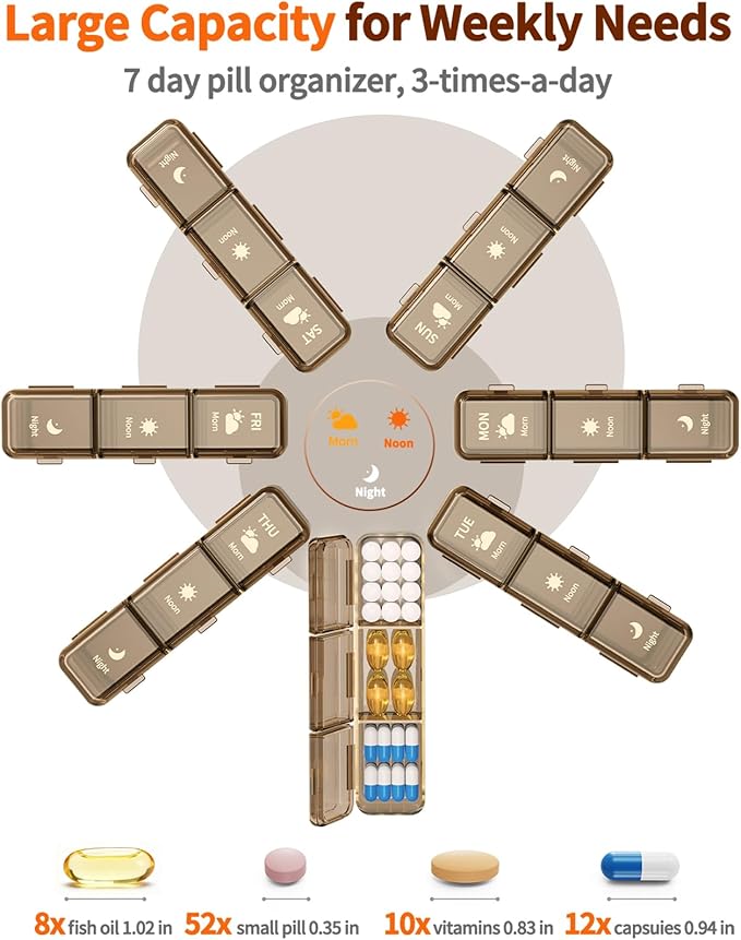 - Large Capacity Weekly Pill Organizer: This 7-day medicine pill organizer is thoughtfully designed with ample space to pre-sort your weekly pills. Easily manage your medication 3x a day (Morning, Noon, Night) by organizing your daily doses in advance. One main organizer with 7 compartments, each compartment can hold up to 8 fish oils, 10 vitamins or 12 capsules, ensuring you have plenty of room for your daily supplements.