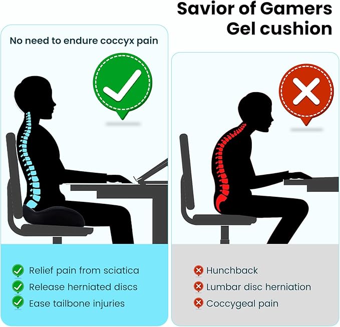 - 【Gamer's Posture Savior】: Dominate leaderboards without tailbone agony! Gaming chair cushion with anti-slip base grips leather/ mesh seats, while U-cut coccyx cushion for tailbone pain prevents numbness during raid nights.