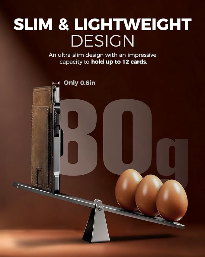 - Accessible Design: This premium wallet combines sleek design with practicality. Its one-touch eject mechanism elegantly displays cards in a layered layout for instant access, while the slim profile eliminates bulk without compromising sophistication. A bottom card hole ensures no card gets stuck, and the spacious money clip easily holds over 10 bills. Perfectly blending style and utility, this wallet is a refined accessory for the modern gentleman.