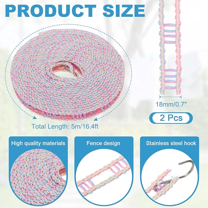 - Package & Size: You will receive 2 pieces of travel clotheslines with 4 pieces of hooks, the width is 18mm/0.7 inch, and the length is 5m/16.4ft, which is good for outdoors and indoors.