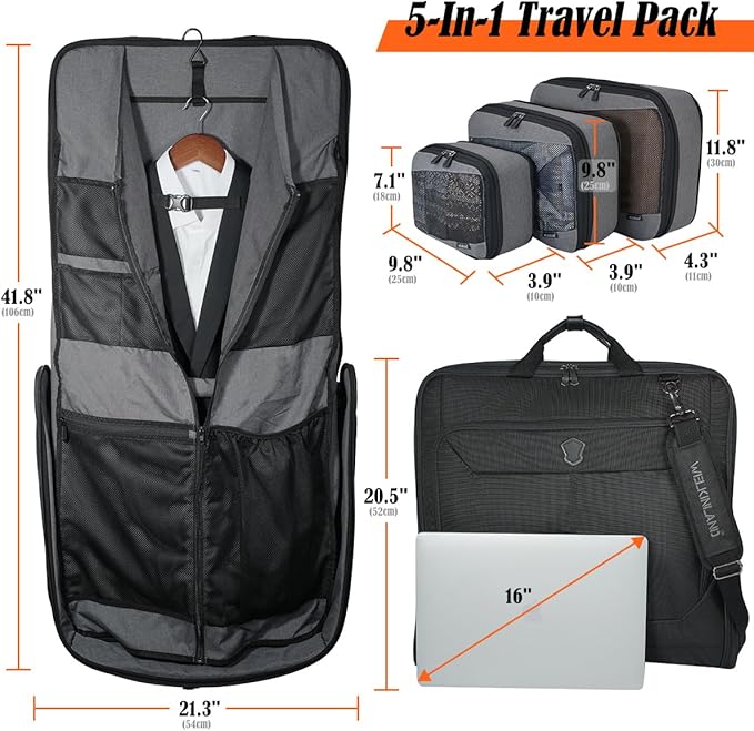 WELKINLAND 3-Suits Garment Bags for Travel W/ 4-Pack Compression Packing Cubes, 30L-Large Carry On Garment Bag for Travel, 15-Pockets Suit Holder Travel Bag, Wrinkle-Free Suit Garment Bag for Men
