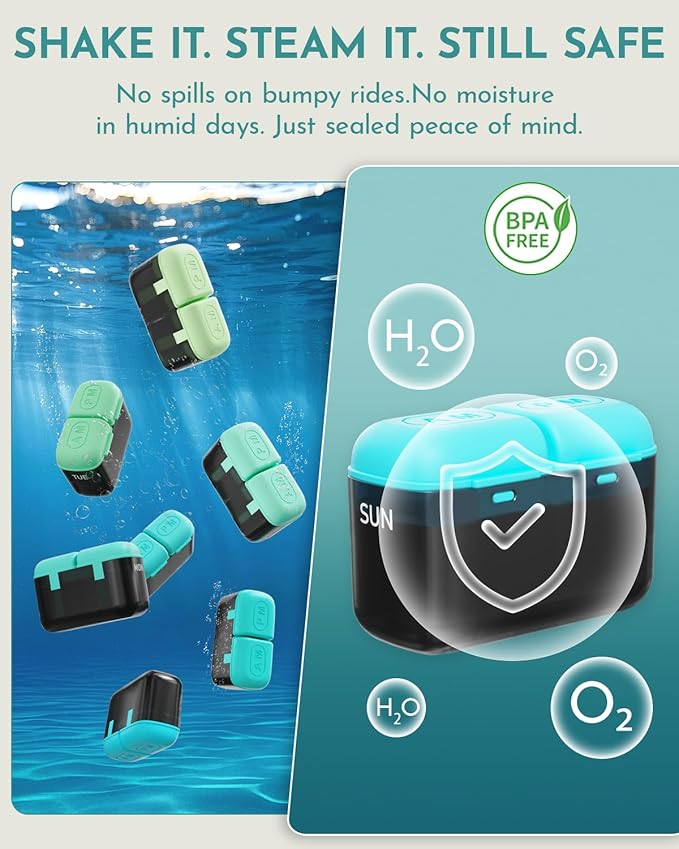 - Moisture-Resistant Design – No More Damp Pills at Home or Away: With a silicone-sealed lid, this pill organizer 2 times a day shields your supplements from humid bathrooms and travel climates. Whether you store it on your nightstand or pack it in your suitcase, your pills stay dry, organized, and ready