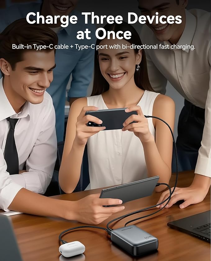 - 【Wide Compatibility】The power bank charges virtually any device - including iPhones 17 pro max(16/15/14), xiaomi 17 pro max, Galaxy (S26/S25), iPads, MacBooks, and AirPods - through its built-in USB-C cable and additional USB-C/USB-A ports, delivering fast charging for phones (up to 45W), tablets, and even laptops while eliminating the need to carry extra cables. (Note: Actual charging speed is affected by the power and charging protocols supported by your phone)