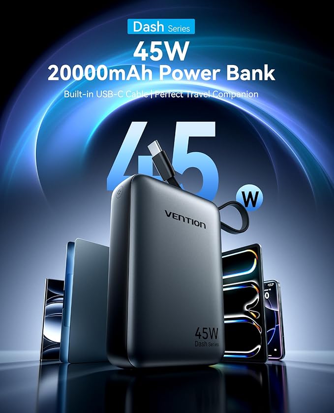 VENTION 45W Power Bank, CCC Certified 20000mAh with Built-in USB-C Cable, Fast Charging Travel Portable Charger with LED Digital Display for iPhone 17/16/15 Xiaomi Galaxy S26/S25 iPad Laptop(Gray)