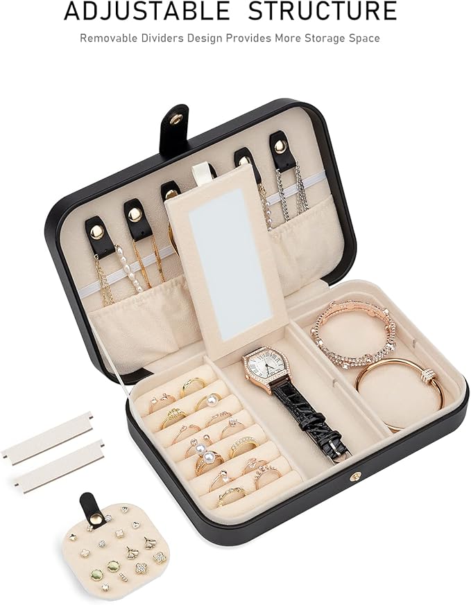 - ① 【Multi-Functional Jewelry Organizer】 This jewelry box features 6 necklace hooks, 1 anti-tangle elastic band, 1 large ring case, 1 removable earring tray, 4 adjustable dividers, and a built-in mirror – keeping your necklaces, bracelets, earrings, and rings neatly stored and tangle-free.