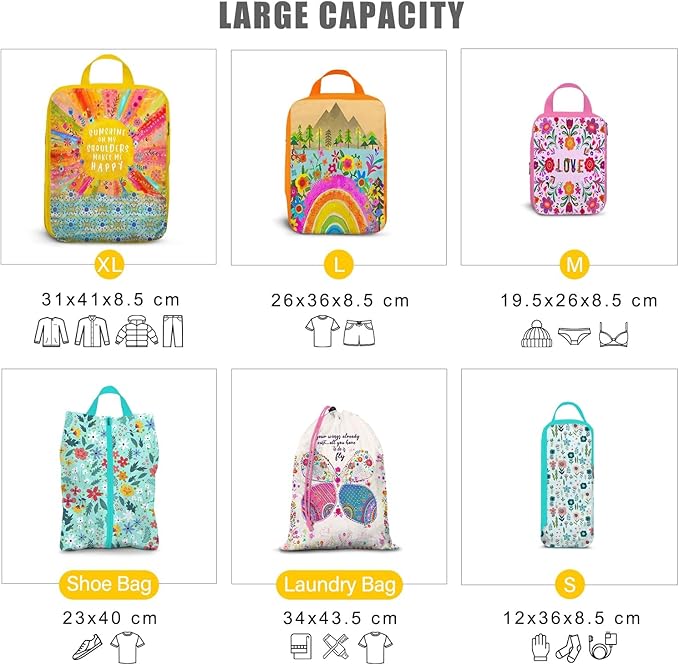 - LARGE CAPACITY PACKING CUBES 6 SET :Each set contains a different assortment of packing cubes. X-Large/Large Travel Packaging Cubes holds a week worth of sweaters, jackets, shirts. Medium/Small holds a week worth of pants, underwear, socks. There is also a shoe bag and a laundry bag for putting shoes and changed dirty clothes.