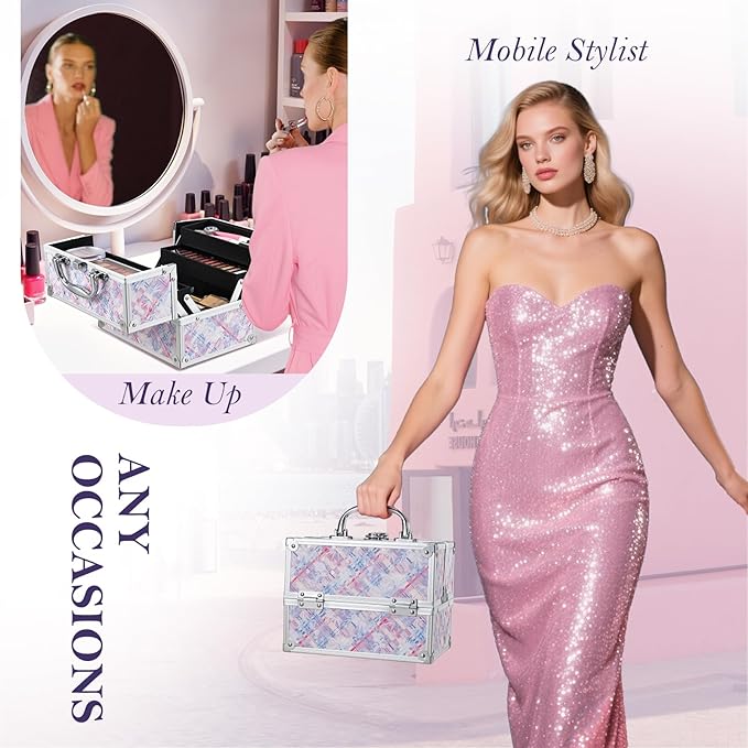 - Pink Plaid Makeup Case: 8.85" x 6.3" x 6.7", it accommodates a variety of cosmetics. Suitable for beginners and professionals alike, it is made from durable ABS with aluminum accents and reinforced metal corners, ensuring both lightweight portability and lasting durability for travel or makeup sessions. The waterproof glitter pink surface protects outdoor cosmetics from environmental factors and shimmers with light, changing hue from different angles.