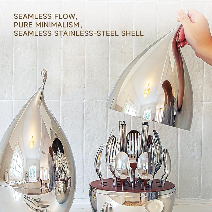 - Premium Craftsmanship: Flatware Set withWaterdrop Storage Organizer are all made Handcrafted from mirror-polished stainless steel for a stunning, silver-like shine.The storage capsule inside haveblack walnut wood adds a touch of sophistication and contrasts beautifully with the gleaming cutlery