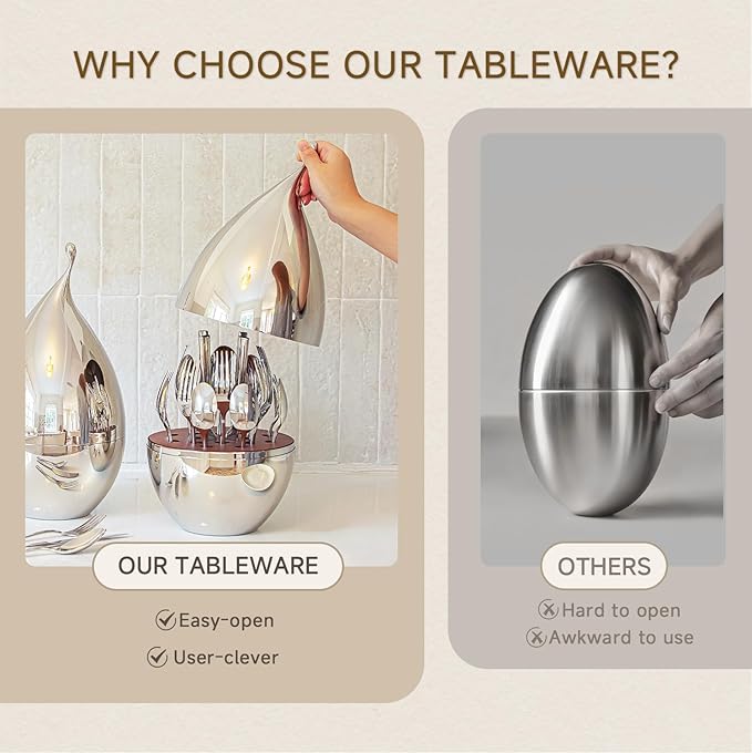 - Premium Craftsmanship: Flatware Set withWaterdrop Storage Organizer are all made Handcrafted from mirror-polished stainless steel for a stunning, silver-like shine.The storage capsule inside haveblack walnut wood adds a touch of sophistication and contrasts beautifully with the gleaming cutlery
