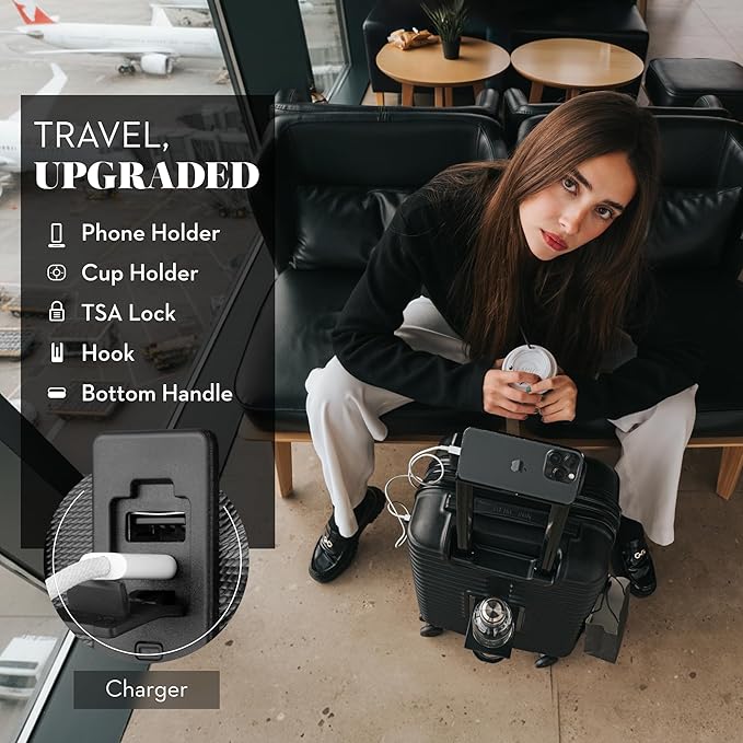 - THE ULTIMATE HANDS-FREE CONVENIENCE Redefine your airport experience. Our innovative design features an integrated cup holder and a multi-stage phone holder, allowing you to navigate terminals with your coffee and boarding pass ready, completely hands-free.