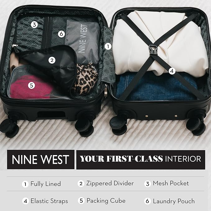Nine West Suvi 20" Inch Smart Carry On Luggage with Wheels, Hardshell Suitcase with Cup Holder & USB Port for Charging, Airline Approved Cabin Bag Midnight Black