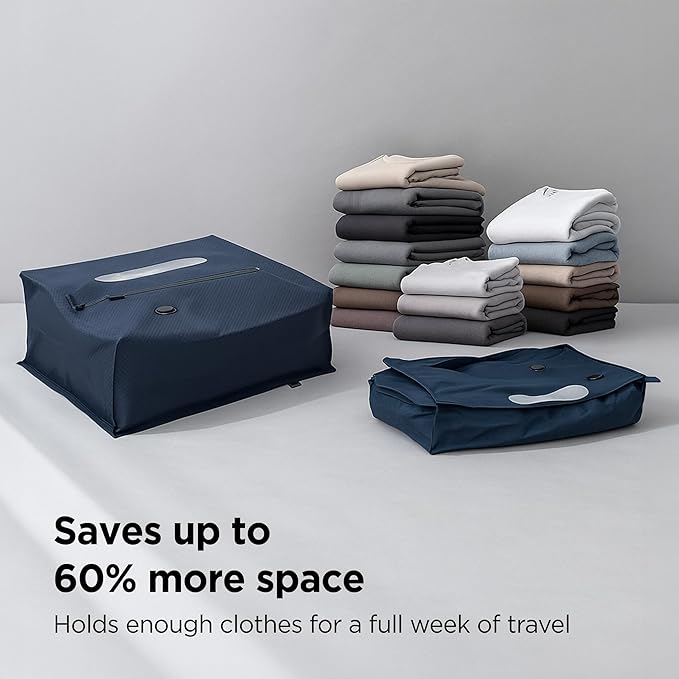 - Vacuum Compression Travel Bags (2-Pack): Designed to maximize space in carry-on luggage. Each bag holds up to 48L and compresses clothing by up to 60% using only manual pressure through the built-in valve, no vacuum pump required. Can be used with a standard vacuum pump (sold separately).