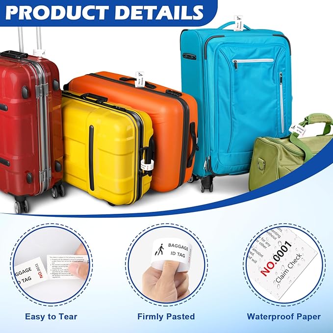 - 【High-Quality Material】Our baggage claim tags are made from durable, waterproof synthetic paper.The information is printed in clear black ink, with eye-catching consecutive numbers and red font prompts. This attractive design ensures durable, easily legible information, making baggage claim checks tags simple in busy airports or train stations.Note: Please use a ballpoint pen instead of a water-based pen to avoid blurring the markings.