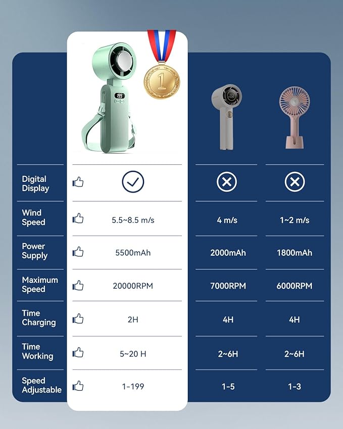 - Ultra-Fast Turbo Cooling: Features an advanced 7-blade design paired with a high-speed three-phase brushless motor, delivering a maximum wind speed of 8.5m/s β 2x faster than traditional hand held fans! With a 20000 rpm maximum speed, it instantly blows away the heat, keeping you cool and comfortable all day long