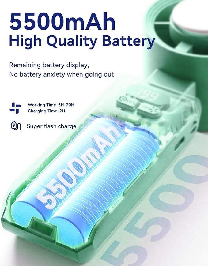 - 20H Max Cooling Time: Our handheld turbo fan is equipped with a powerful 5500mAh rechargeable battery, offering up to 20 hours of cooling time on a single charge, twice the capacity of a standard handheld fan. Enjoy flexible usage with 5-20 hours of runtime, depending on the speed setting. Recharging is quick and convenient, taking just 2 hours via a regular outlet, power bank, or any USB-compatible device