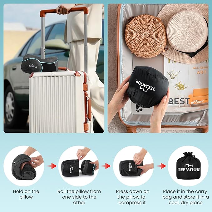 - ๐๐๐๐๐๐๐๐ & ๐๐๐๐๐๐๐๐๐๐---Designed for easy travel, the Teemour travel neck pillow can be compressed and stored in the included compact carry bag , easily attaching to luggage, backpacks, or tote bags. Lightweight design travel pillows for airplanes can be hassle-free additions to your travel essentialsโperfect for international flights, Driving, camping, or daily commutes.