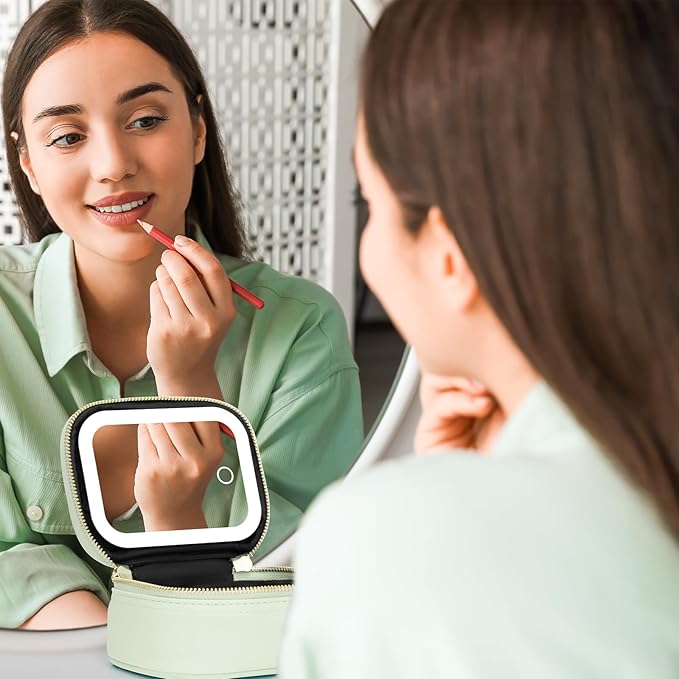- 【Quality Material】The make up mirror bag is made of waterproof PU leather, easy to clean, lined with durable polyester fiber Built-in 500 mAh battery, Type-c connector for quick charging, and the mirror is also removable.