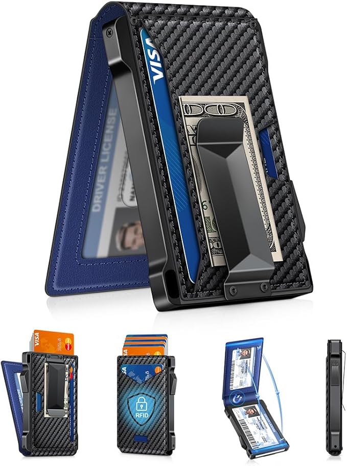 - QUICK CARDS ACCESS: This minimalist wallet for men features a smooth pop-up mechanism. Just press the side button, and the cards slide out in a stepped layout for easy access.