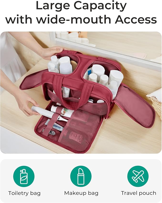- Easy Access and Keep Upright : Full opening and not piling up for easy access to items. Double side full open design of travel bag for toiletries keeps cosmetic bottles and toiletries can stand upright in the middle compartment. Avoid leakage during transit
