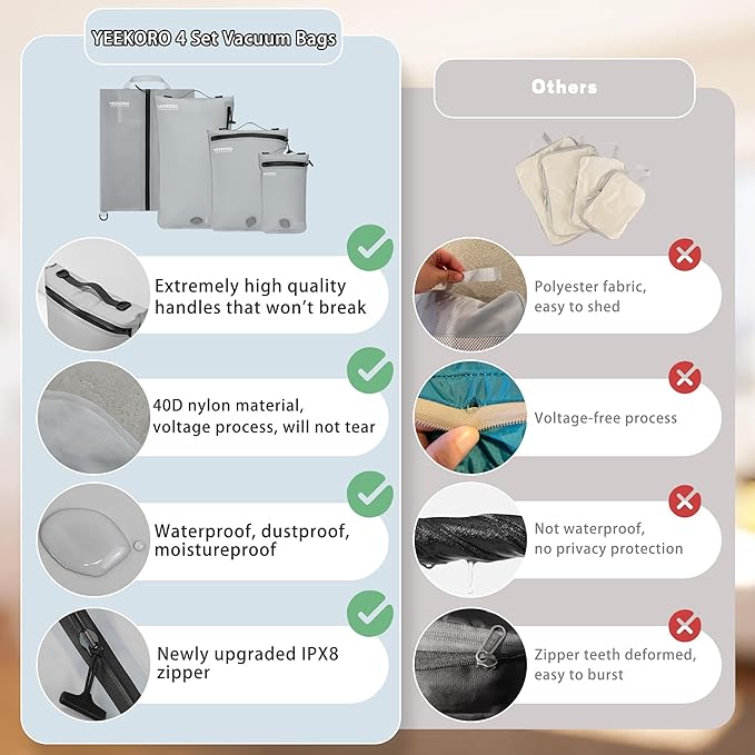 - 【Kindly Reminder】1.Do not place sharp objects inside to avoid puncturing the vacuum bag;2.When using, ensure the airtight zipper is fully zipped;3.The included air pump is a corded air pump;4.The included pump plug is designed for US/CA specifications,only works on 120V. Do not use in Europe or other countries