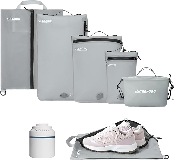 - 【Material Construction】3 travel airtight compression bags: Adopt a dual-layer protective structure, made of 40D nylon fabric combined with single-layer 8-micron TPU. Equipped with IPX8 waterproof zippers for 100% waterproof performance; Toiletry bag: Crafted from 40D nylon; Shoe bag: Made of 230T polyester grid PU fabric (non-waterproof), featuring excellent abrasion resistance, tear strength, reinforced corners and load-bearing handles