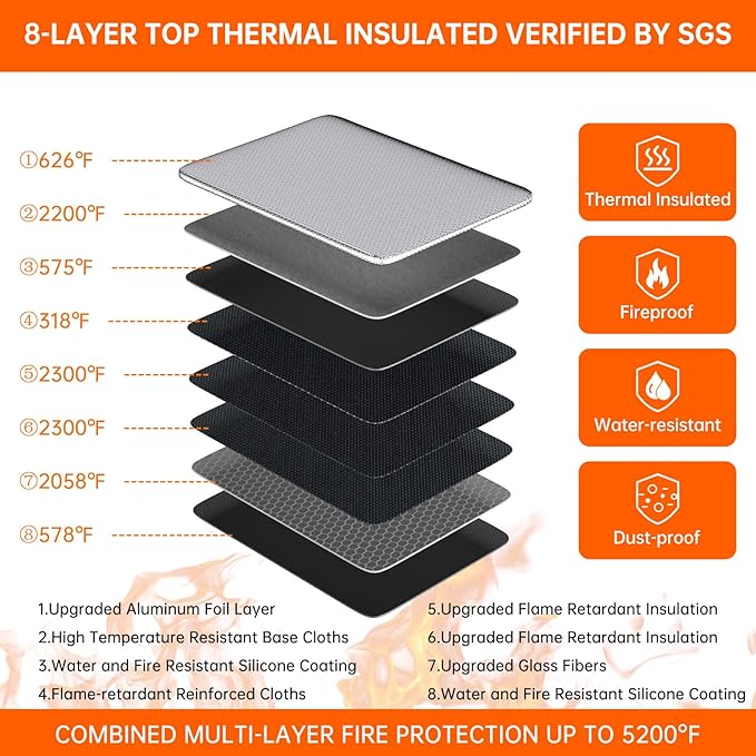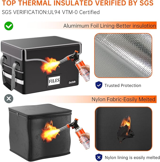 - Upgraded Fireproof Heat Insulated Materials: The Upgraded DocSafe fireproof document box is made of thickened silicone coated fireproof cotton material and aluminum foil (double safe protection). Its 8-layer fireproof layers can withstand the temperature up to approximately 5200℉. Aluminum foil lining isn’t easily melt under high temperature. It has been passed by SGS TEST(UL94 VTM-0 Certified). Hook&Loop all around the zip and lock for better protection against fire/water