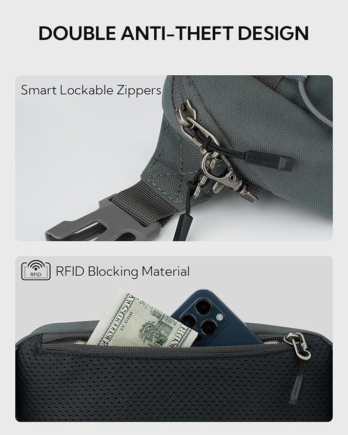 - Dual Anti-Theft Protection – Features a lockable front zipper and a hidden rear pocket lined with RFID-blocking material. Safeguards your phone, cards, passport, and cash from both physical pickpockets and digital threats while you're on the move.