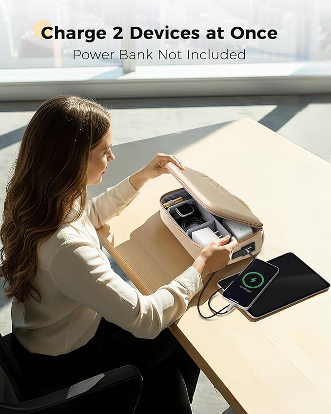 - USB Charging Ports: This hardshell travel charger organizer is designed with USB charging ports on the side (excluding a power bank) for easy charging of electronic devices on the go. It is compatible with USB-A and USB-C charging ports (excluding charging cable), and can charge 2 devices at once. This is an hardshell electronic organizer bag designed specifically for travel. "Free your hands, charging on the go"