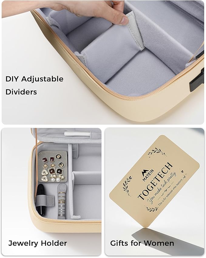 - Well Organized & DIY Space: The tech travel bag includes 2 small pockets, 1 stylus holder, 1 ring row, 1 earring panel, a retractable band (to secure lipstick, etc), and 3 adjustable padded dividers, allowing you to DIY the internal layout to suit your specific needs. It can perfectly hold your electronic accessories such as USB Cables, External Hard Drive, Wall Charger, SD Card, Bluetooth Headphones, and more. "You’re not just carrying convenience — you’re carrying peace of mind"