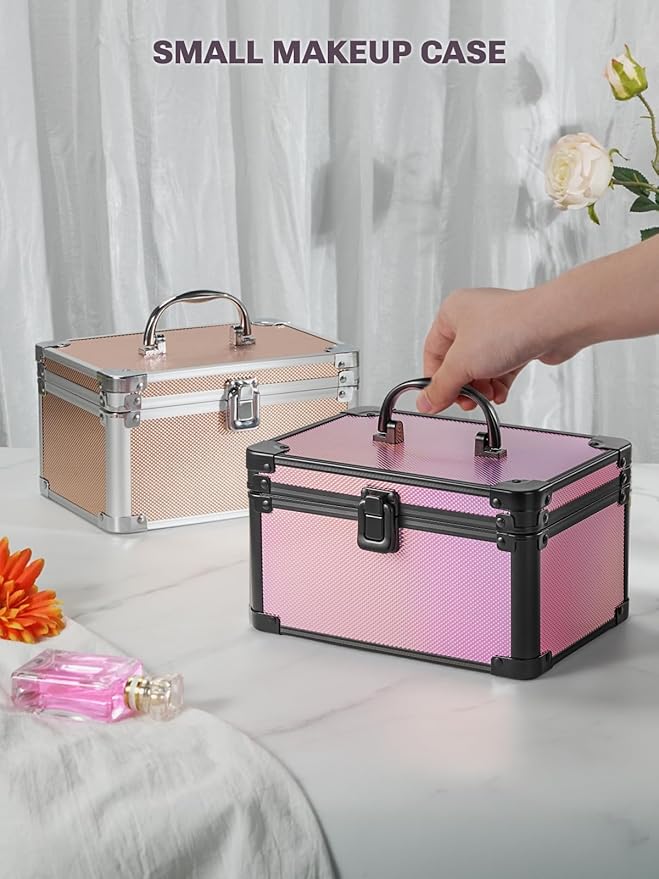 Qislee Makeup Box Mini with A Detachable Lighted Mirror, Waterproof Small Makeup Case,Cosmetic Organizer and Travel Train Case with Magnetic LED Mirror(Black Frame Iridescent Pink)