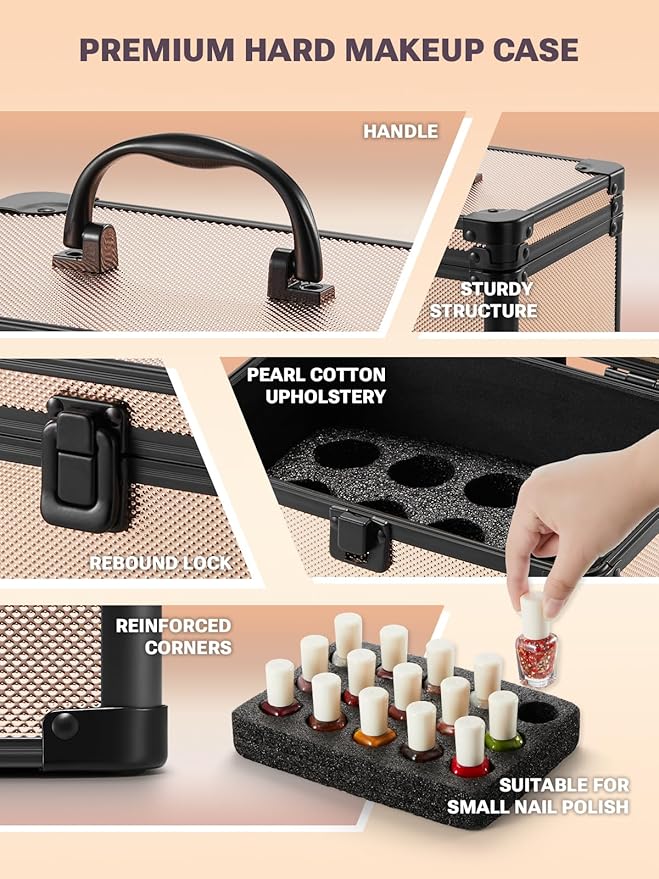 - Durable & Protective Build:Reinforced edges, a snap-lock closure, and a top-mounted handle ensure comfortable carrying. The waterproof exterior and padded interior with pearl cotton lining safeguard cosmetics from spills and bumps—perfect for travel makeup case with mirror adventures