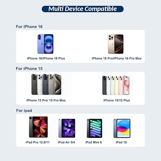 - Compatible Devices : iPhone 16/16 Plus/16 Pro/16 Pro Max/16 e,iPhone 15/15 Plus/15 Pro/15 Pro Max,apple iPad Pro 13-in.(M4),iPad Pro 11-in.(M4),iPad Air 13-in.(M3),iPad Air 11-in.(M3),iPad (A16),iPad mini (A17 Pro), iPad Pro 12.9-in.(6th Gen),iPad Pro 12.9-in. (5th Gen),iPad Pro 12.9-in. (4th Gen),iPad Pro 12.9-in. (3rd Gen),iPad Pro 11-in.(4th Gen),iPad Pro 11-in. (3rd Gen),iPad Pro 11-inch (2nd Gen),iPad Pro 11-inch, iPad Air 11-in.(M2),iPad Air 13-in.(M2),iPad Air (5/4th Gen),iPad (10th Gen),iPad mini (6th Gen),and more USB-C devices iPhone 16/16 Plus/16 Pro/16 Pro Max/16 e,iPhone 15/15 Plus/15 Pro/15 Pro Max,apple iPad Pro 13-in.(M4),iPad Pro 11-in.(M4),iPad Air 13-in.(M3),iPad Air 11-in.(M3),iPad (A16),iPad mini (A17 Pro), iPad Pro 12.9-in.(6th Gen),iPad Pro 12.9-in. (… See more