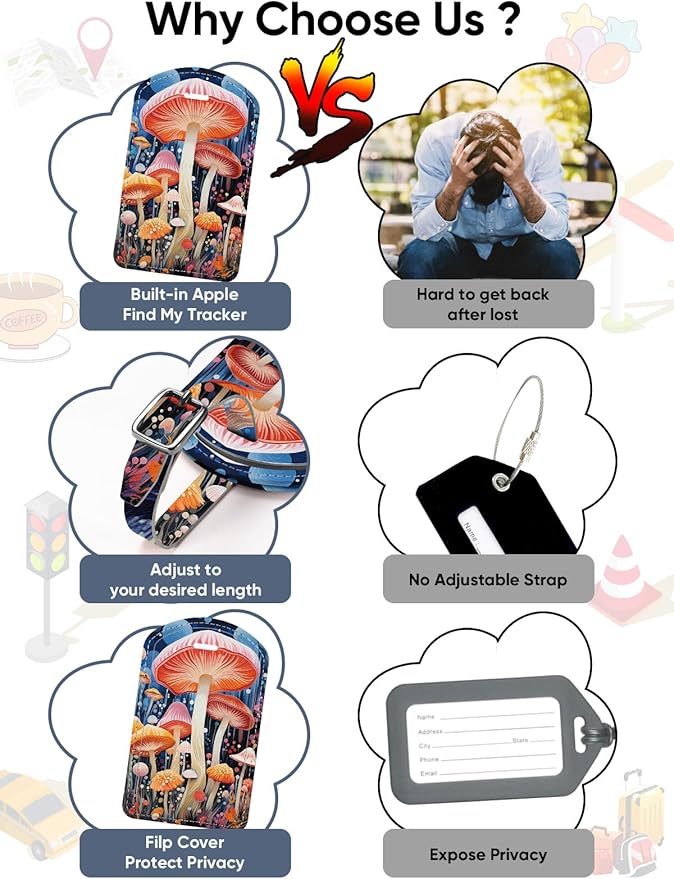 Luggage Tags Built-in Anti-Loss Tracker, Luxury Leather Luggage Tags for Suitcase, Travel Bags, Backpacks, Travel Organizer for Lost Baggage Prevention (Mushroom)