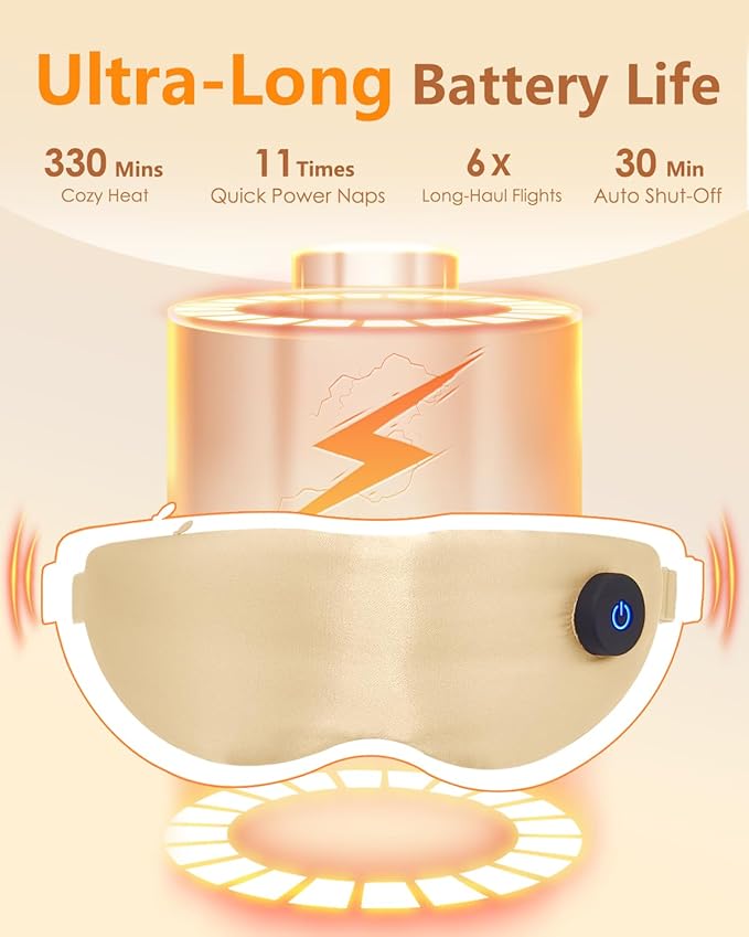 - 【Large Capacity & Certified Safe Battery】 Our sleeping eye mask features a high-capacity, safety-certified rechargeable battery, ensuring reliable use and peace of mind. A single charge provides up to 330 minutes of soothing warmth—enough for 11 naps, 6 cross-country flights, or a full week of nights of relaxation. The rechargeable battery is both environmentally friendly and durable, perfect for everyday use