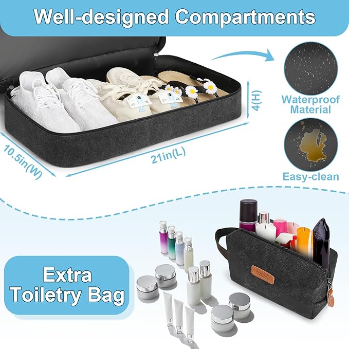 - 2pcs Expandable Canvas Travel Duffle Bag: This duffle bag(Size: 21"L*13"H*10.5"W) set comes with a toiletry bag. Designed for comfort travel. This versatile design offering extra packing flexibility, making this duffle bag the perfect companion for any journey. This mens travel bag features a paded handle and a soft, adjustable and detachable shoulder strap. Choose from hand-held, shoulder, or cross-body carry modes. Suitable for both men and women.