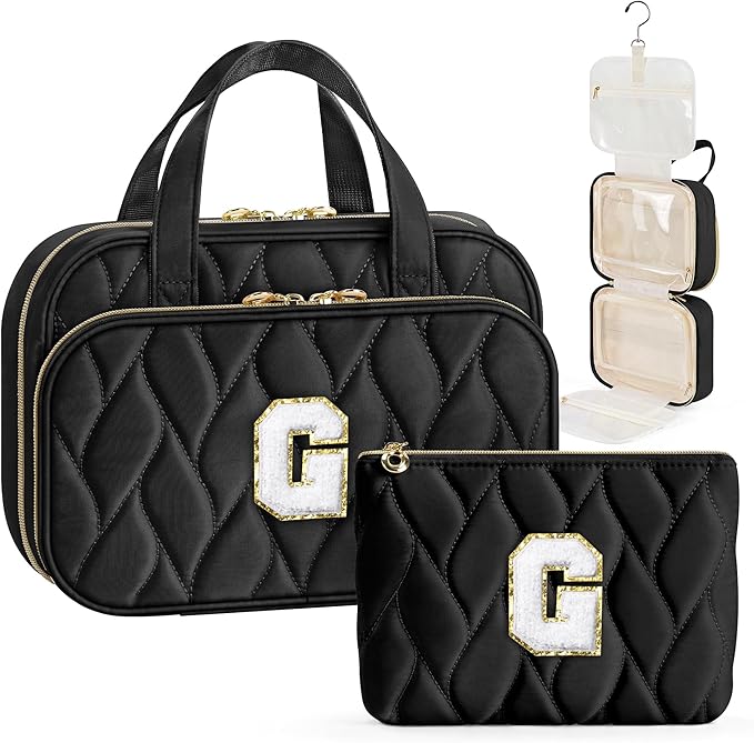 YOOLIFE Initial Toiletry Bag Travel Makeup Bag for Women - Hanging Toiletry Bag, Personalized Birthday Gifts for Women, Vacation Airplane Essentials Black - G