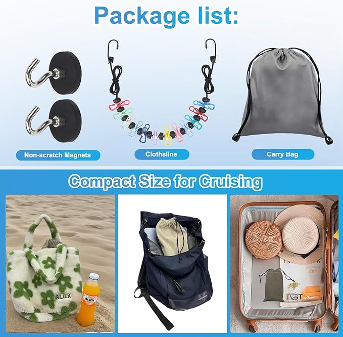 - VERSATILE DESIGN: Magnetic clothesline with 2 strong rubber-coated magnets hooks that attach securely to metal surfaces in cruise ship cabins and staterooms