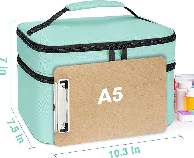 - Double Layers Design: The size of this medicine bag is 10.3in*7.5in*7in, which is similar in size to a tablet. The prescription bottle organizer top compartment with elastic loops provides extra space for different size bottles, prevents contents from falling out if bags tipped over. Medication bottle organizer has 2 large mesh pockets to storage medical supplies like pills, eyedrops, toiletries, etc