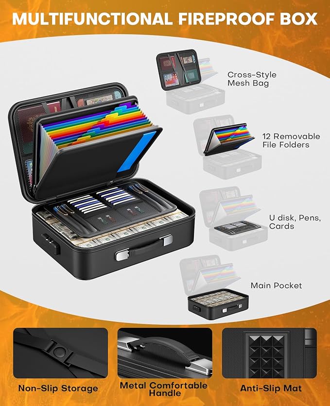 - 【Detachable Organ Page Folder】This fireproof document organizer box comes with 12 accordion bags—its detachable design makes it more convenient to carry and use separately when on the go, keeping your papers organized and secure