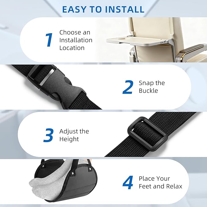 - Adjustable Fit for Everyone:Designed with an extra-long adjustable strap, this leg hammock for airplane travel easily adapts to travelers of all heights. Simply secure the plane foot hammock to the tray in front of you, adjust the length, and rest your feet in the most comfortable position throughout the trip.