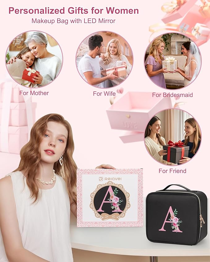 Relavel Initial Makeup Bag with LED Mirror for Women Girls, Personalized Travel Cosmetic Organizer Train Case, Birthday Gifts for Grandkids Bridesmaid Graduation Teacher Friends, Trendy Stuff, Black S
