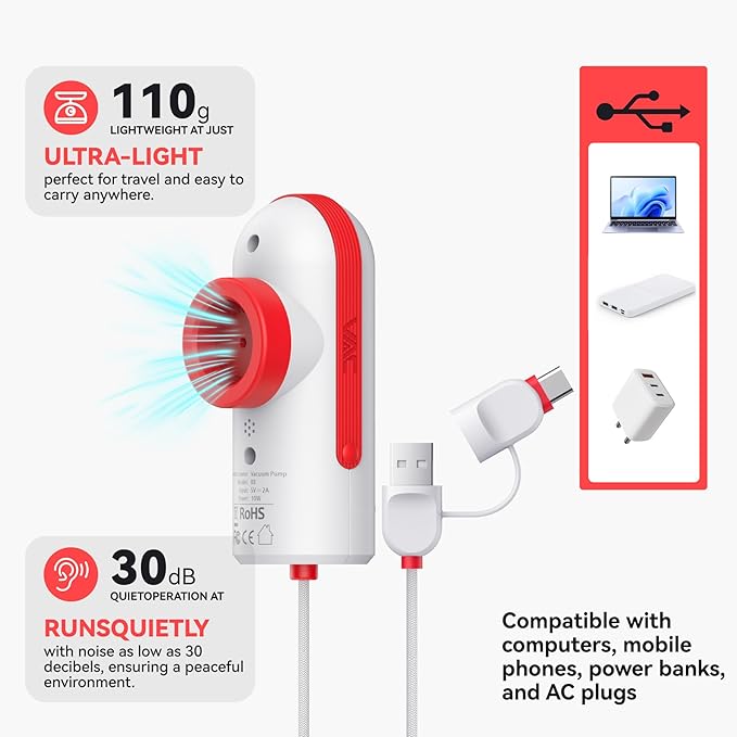 - Unique Creative Desig: The vivid color matching and unique shape design enhance the visibility of the product,The extension cable is neatly wrapped around the vacuum pump for easy organization, Lightweight and slim, the pump is easy to hold and fits seamlessly into luggage, backpacks, or handbags.